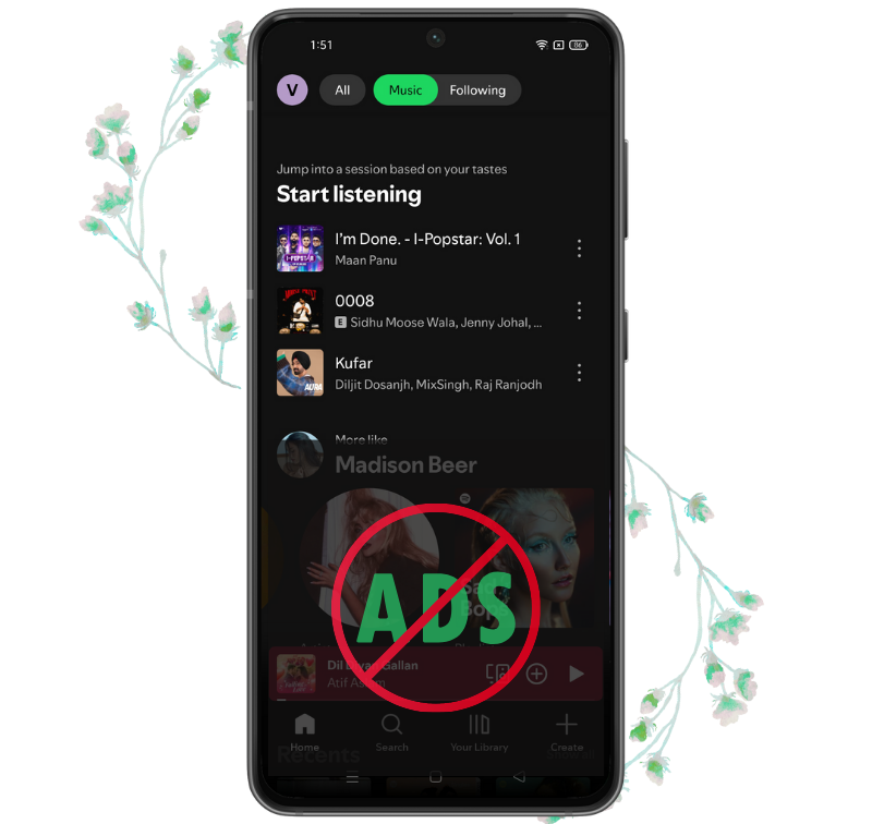 It gives you access to millions of songs without restrictions. Spotify Premium Mod APK with lyrics allows you to enjoy ad-free music. There is no limit on skipping or selecting tracks, so you can enjoy whatever you want anytime. You can create, edit, or share playlists freely without worrying about regional limits.